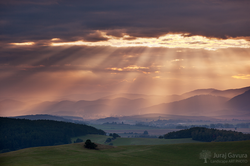 Krajina Turčianskej kotliny pri jesennom západe slnka.