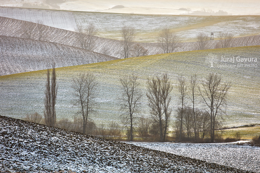 Krajina Turčianskej kotliny pri zimnom západe slnka.