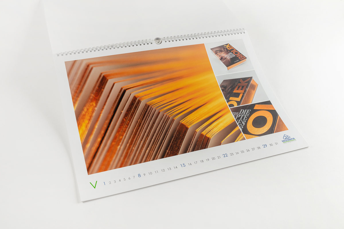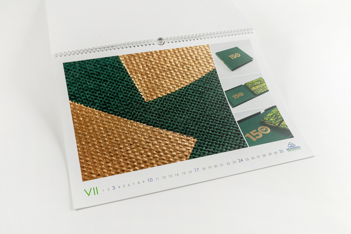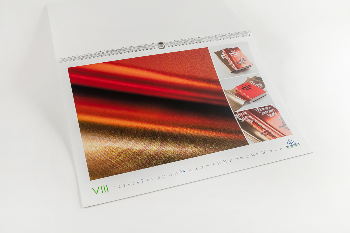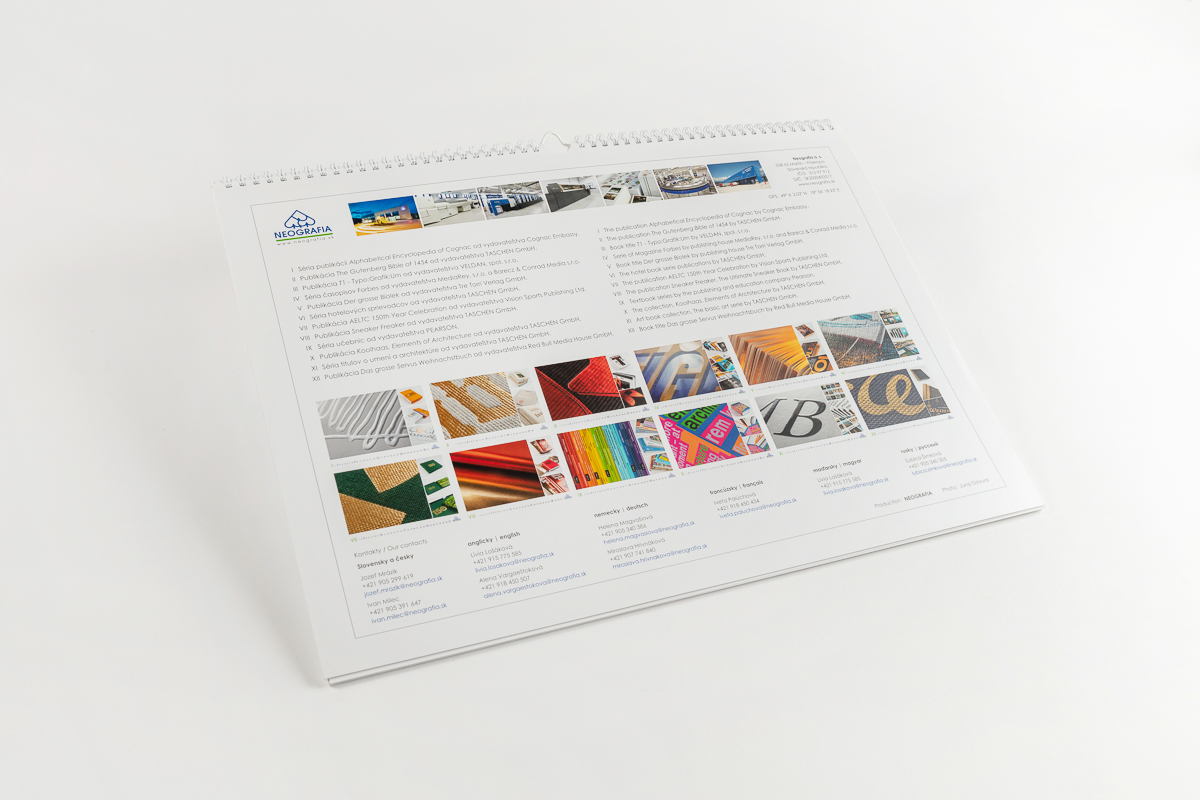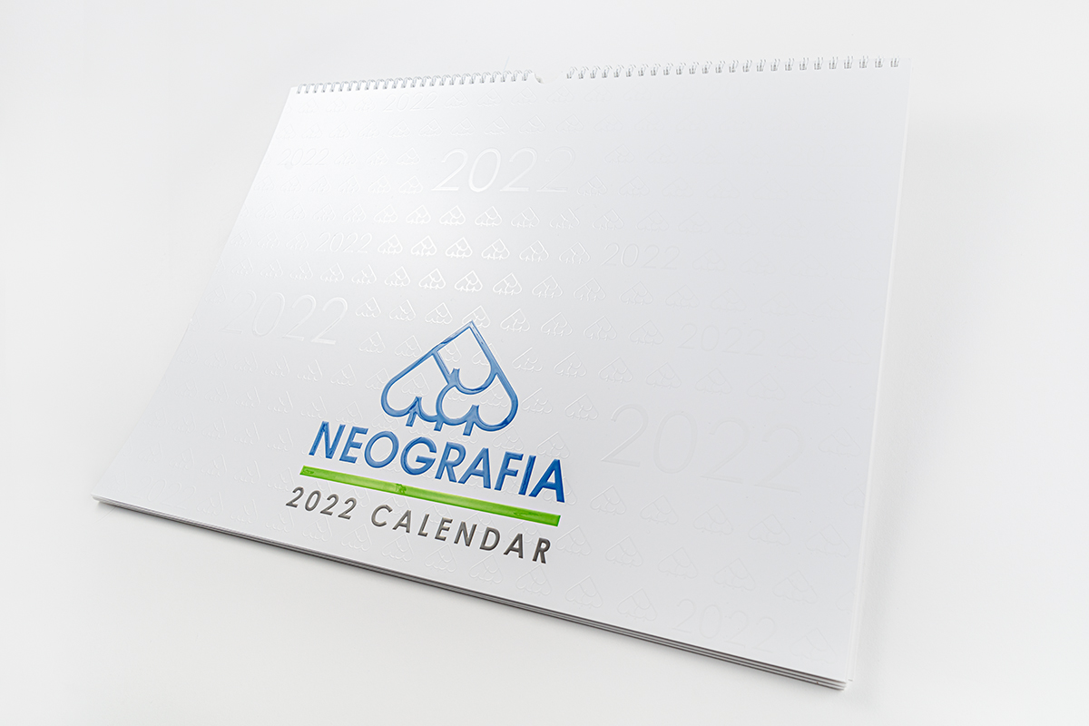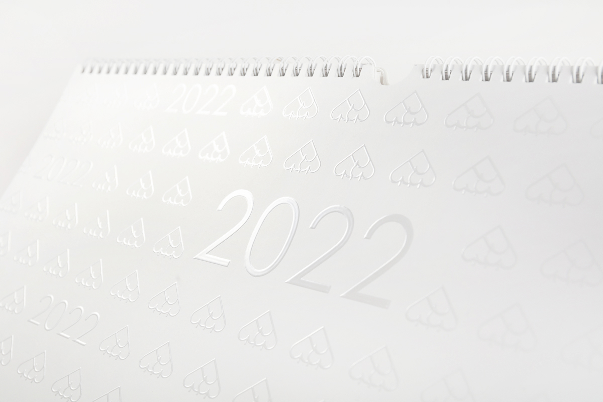 Produktový kalendár pre firmu Neografia a.s. na rok 2022. Kalendár zobrazuje rôzne povrchové úpravy produktov v detailnom priblížení, ktoré pôsobí ako abstrakt.