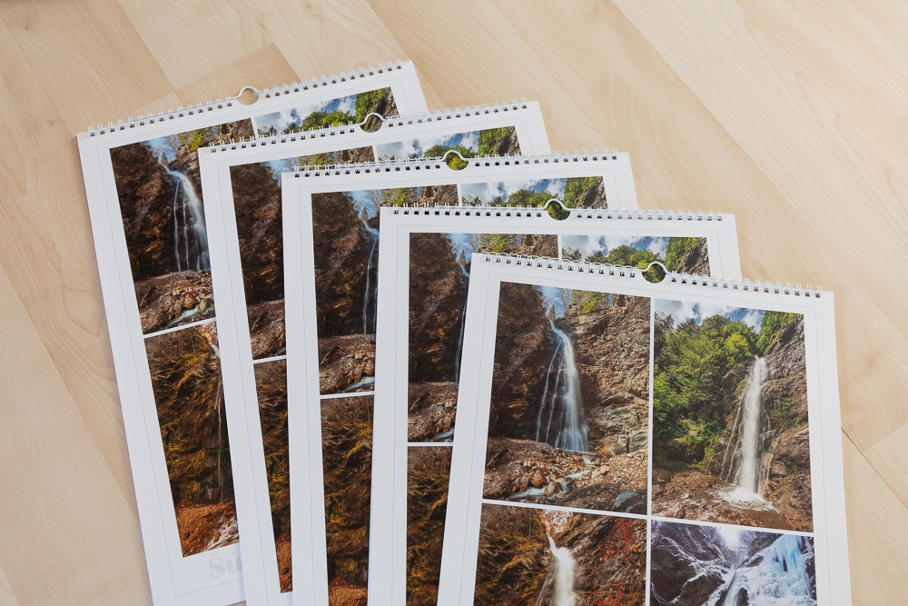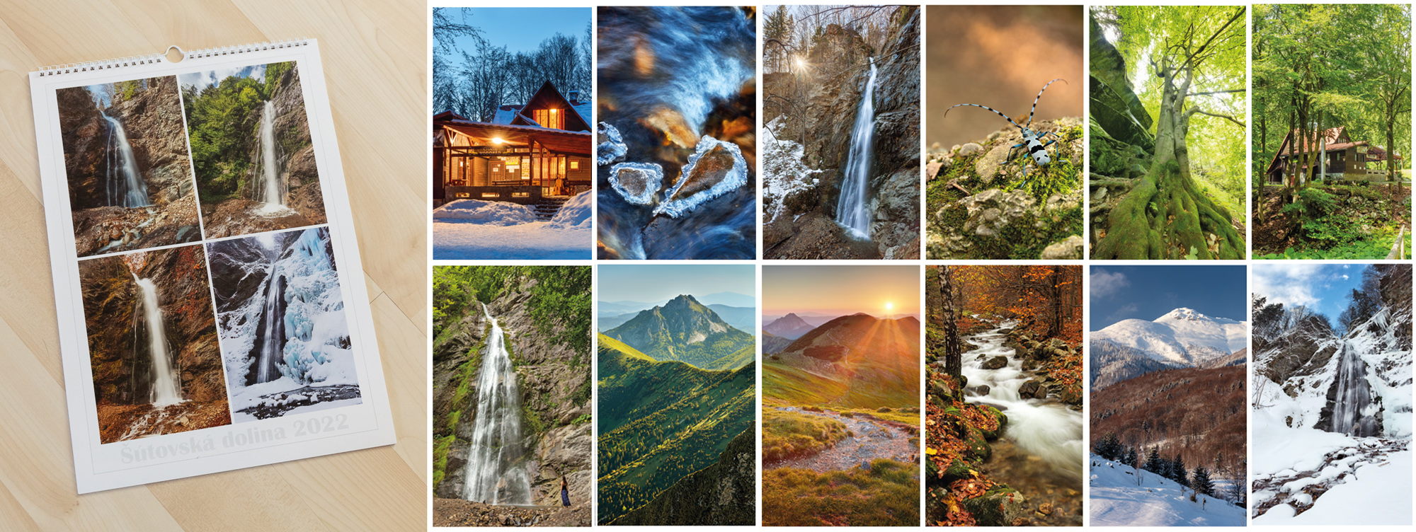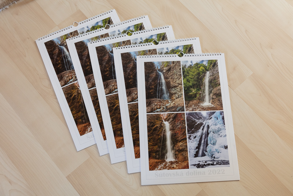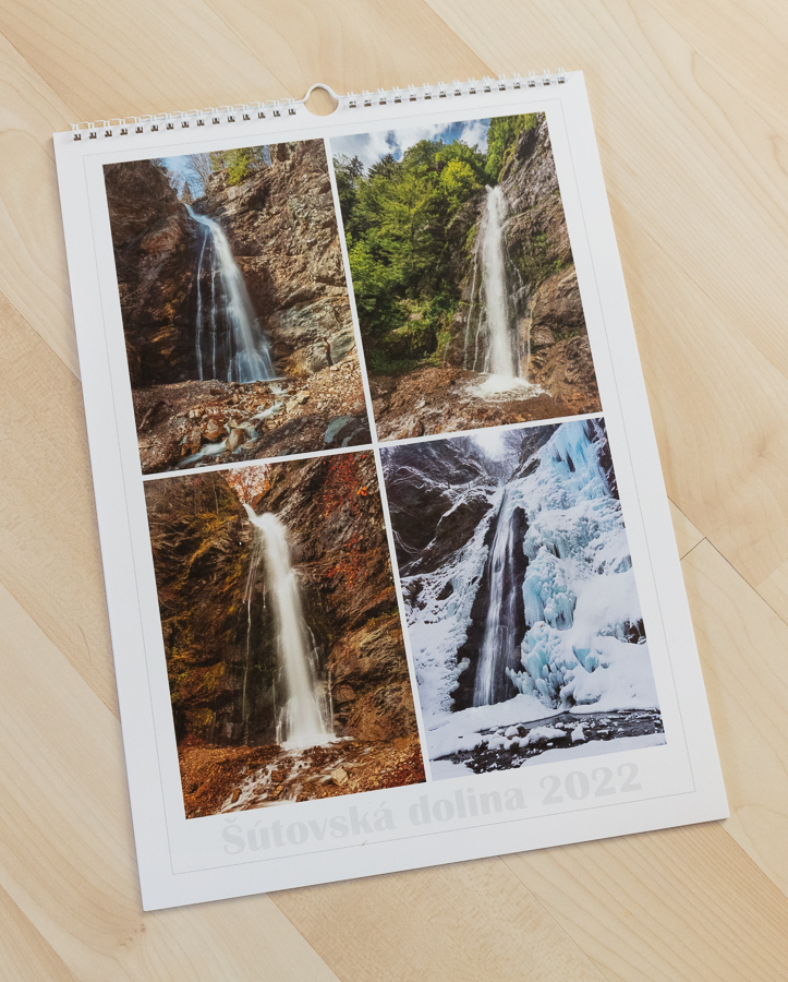 Nástenný kalendár pre chatu vodopád v Šútovskej doline v Malej Fatre. Kalendári som použil fotografie zo Šútovskej doliny, Šútovského vodopádu a hrebeňa Krivánskej Malej Fatry.
